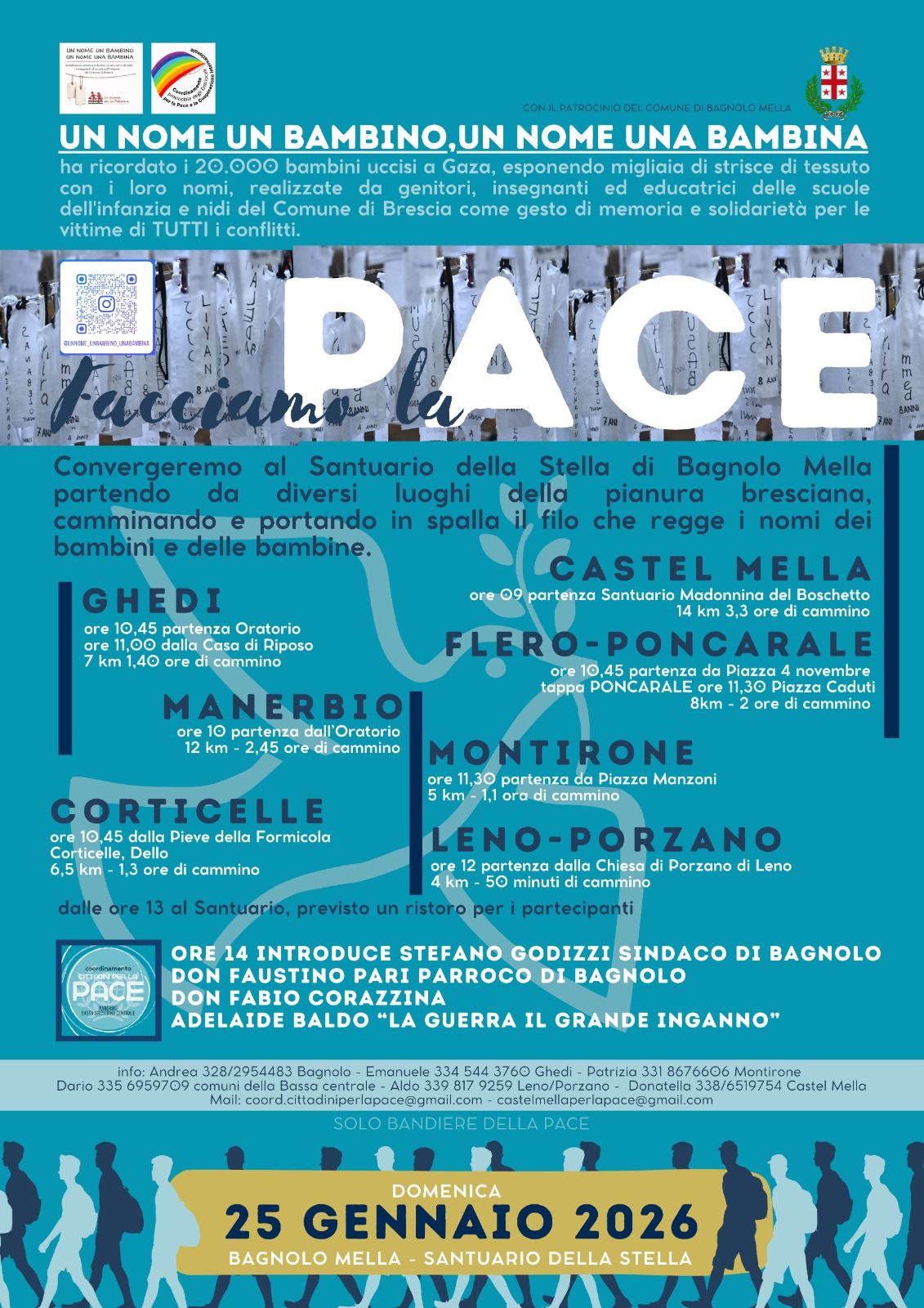 Santuario della Stella di Bagnolo Mella partendo da diversi luoghi della pianura bresciana, camminando e portando in spalla il filo che regge i nomi dei bambini e delle bambine. Partenze da: Castel Mella, Montirone, Flero, Poncarale, Manerbio, Corticelle, Leno e Ghedi