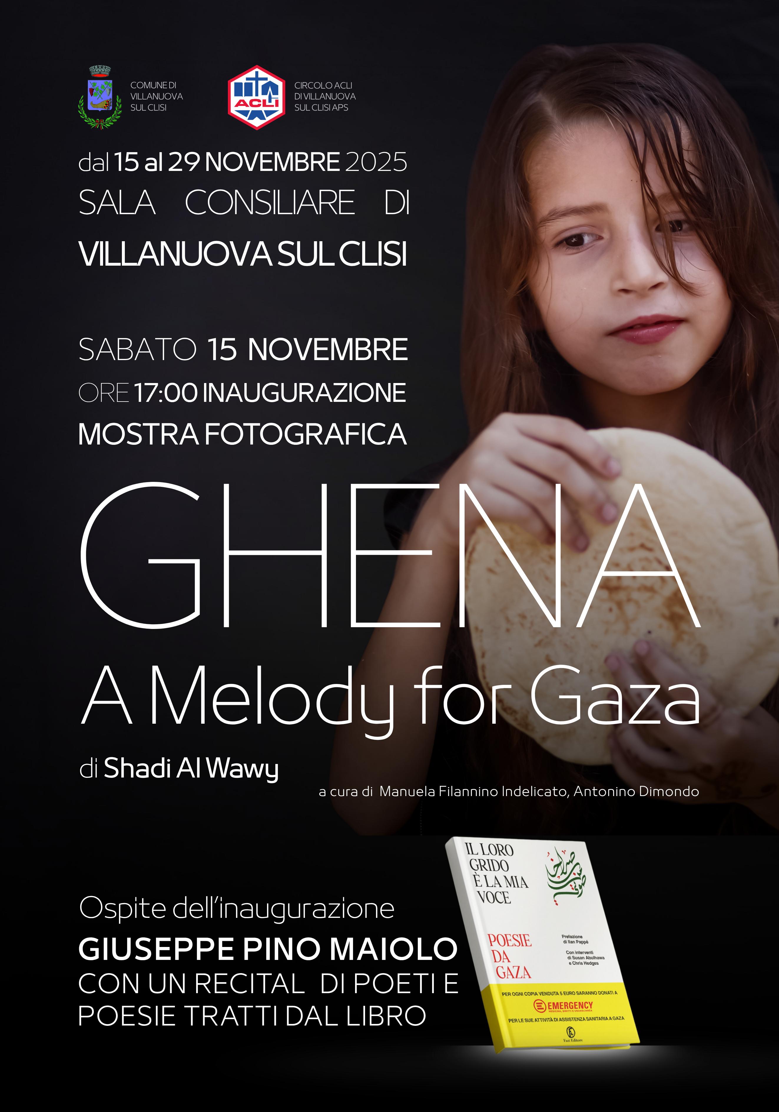 Sarà ospitata presso la Sala Consiliare del Comune di Villanuova sul Clisi la mostra fotografica itinerante “GHENA. A Melody for Gaza”, un progetto di Shadi Al Wawy, a cura di Manuela Filannino Indelicato, Antonino Dimondo e Ilaria Giani. L'organizzazione dell'esposizione è a cura del Circolo Acli di Villanuova.