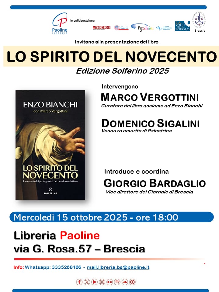 L’incontro è organizzato dalla Libreria Paoline e da La Voce del Popolo in collaborazione con le Acli di Brescia, l’Azione Cattolica, il Movimento Ecclesiale Carmelitano, Missione Oggi e Pax Christi.