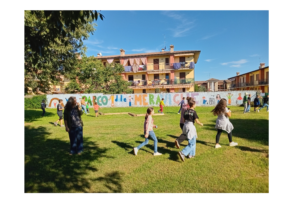 L’area verde individuata dopo una serie di altre ipotesi è adiacente alla scuola dell’infanzia Santa Caterina: un cancello collega direttamente il parco alla scuola, aprendo la strada a una visione ancora più profonda e significativa. Così ha preso forma un’altra idea: rendere il parco uno spazio a servizio dell’infanzia e della comunità. Durante il giorno rappresenta un’estensione della scuola, un luogo sicuro dove bambine e bambini possono giocare e crescere a contatto con la natura. Dal pomeriggio alla sera, invece, il parco si apre a tutte le famiglie e alla cittadinanza, diventando un punto di incontro, gioco e condivisione per l’intero quartiere.